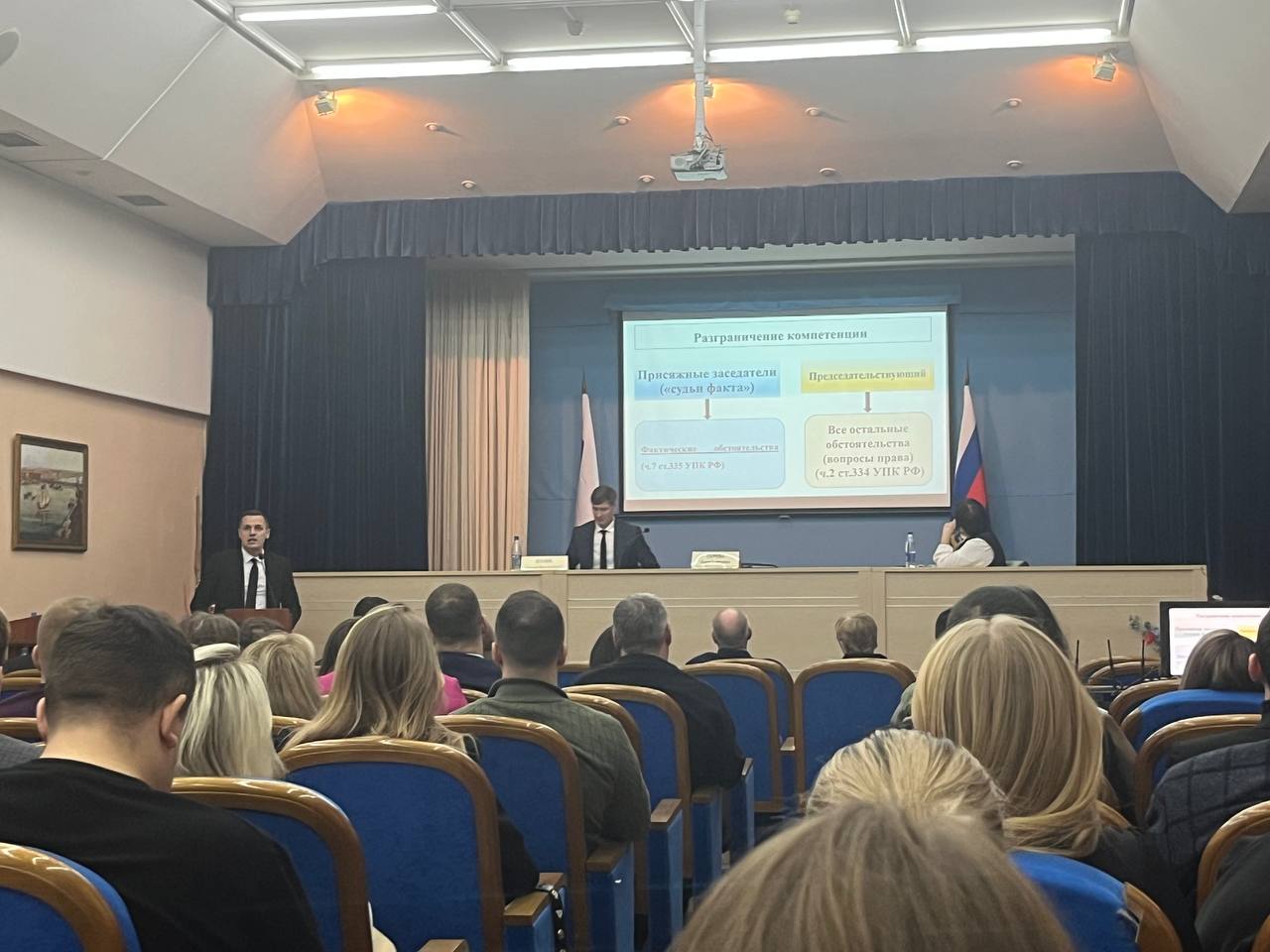 | Судья Великолукского городского суда Псковской области Спасов М.А. выступил с научным докладом на тему «Проблемы формулирования вопросного листа в суде с участием присяжных заседателей с позиции предмета доказывания по уголовным делам» в Санкт-Петербургском юридическом институте (филиале) ФГКОУ ВО «Университет прокуратуры Российской Федерации» в рамках работы IV Всероссийской научно-практической конференции «Уголовный процесс: от истоков к современности», где осветил актуальную проблему, связанную с отражением в вопросном листе при рассмотрении уголовных дел в судах с участием присяжных заседателей обстоятельств, связанных с субъективной стороной состава инкриминированного подсудимому преступления, раскрыв историю рассматриваемой проблематики, современные тенденции судебной практики и предложив аргументированную позицию по разрешению возникающих у судов по данному поводу правовых коллизий. |